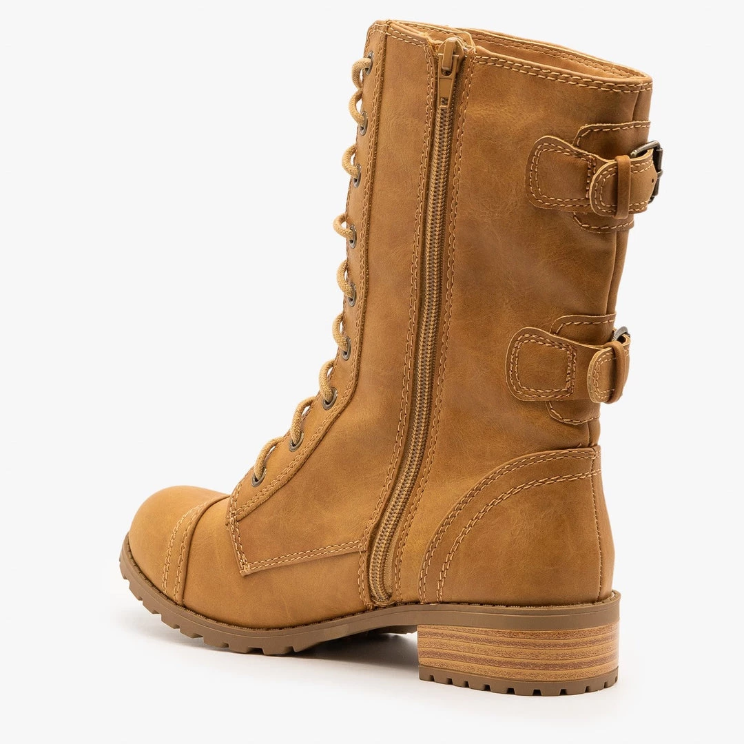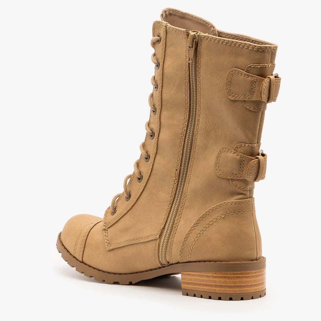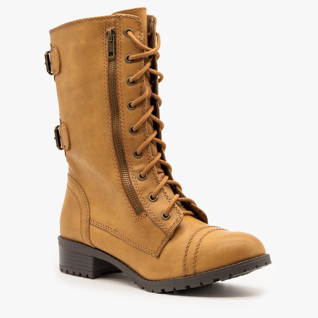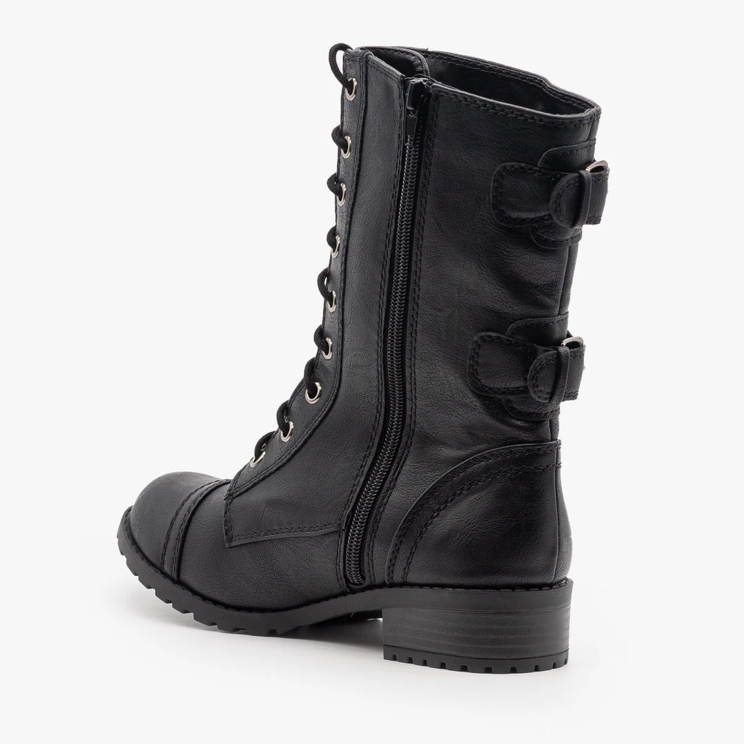 Take on the day in these edgy Soda Shoes Dome-SA combat boots! Crafted with faux leather, these boots feature a 1.5″ block heel and an almond shaped toe.They lace all the way up the front and have a decorative zipper that runs along the outside edge of the laces, making these boots a little edgier. Two decorative buckles on the back complete the look. Pair these boots with tall socks, black skinny jeans, a boxy crop top and an oversized utility jacket for a casual, everyday look! Made with all man-made/vegan materials and runs true to size.