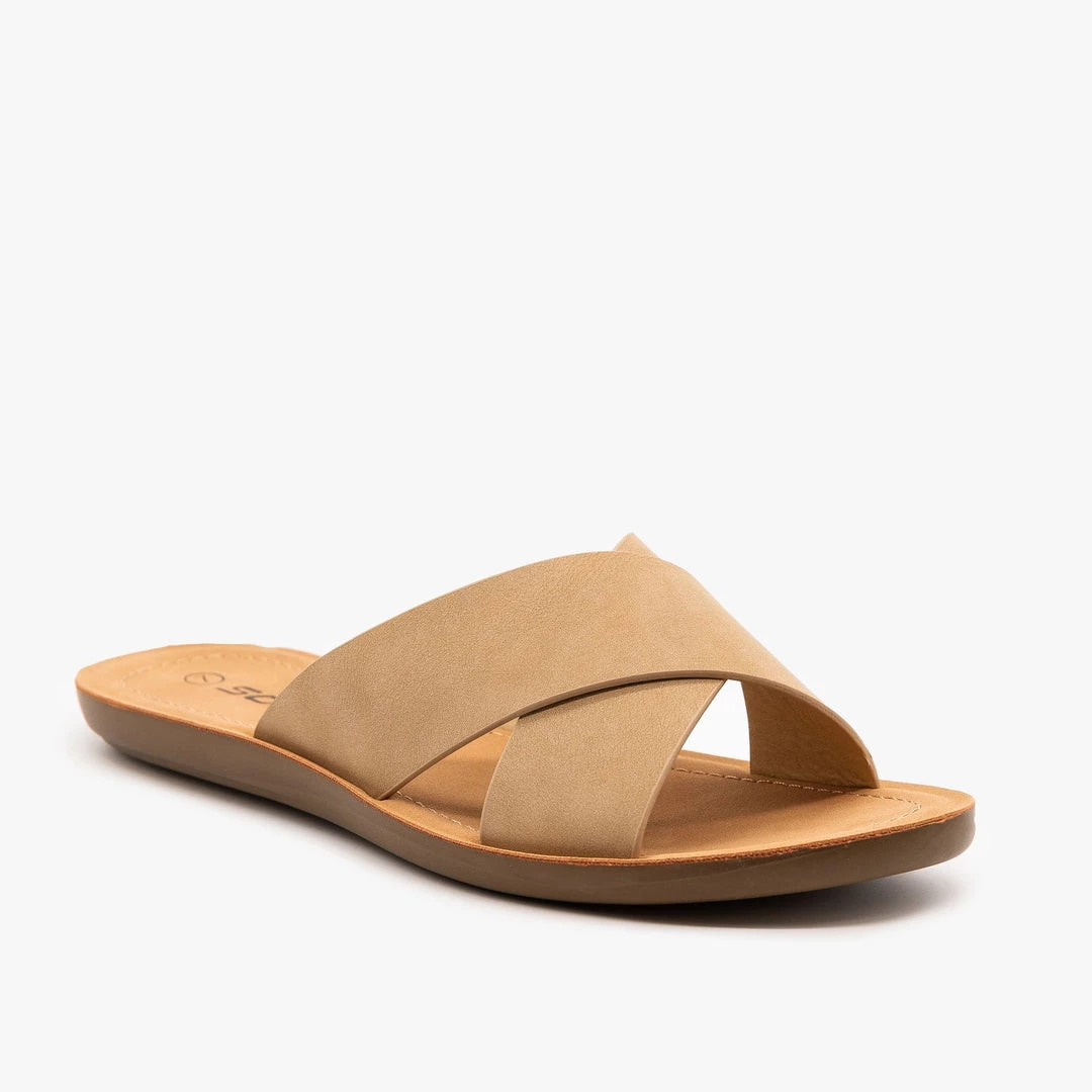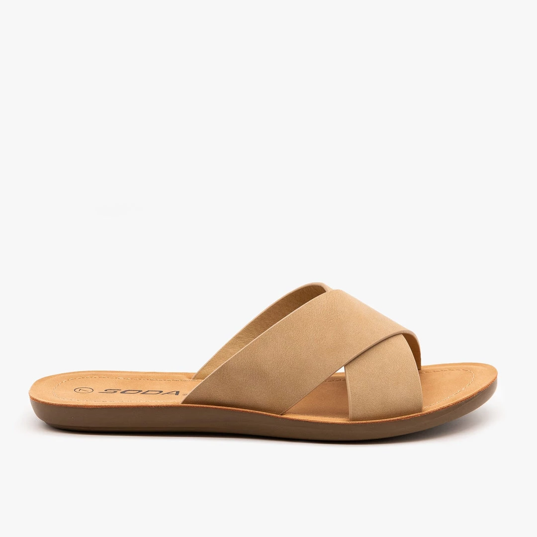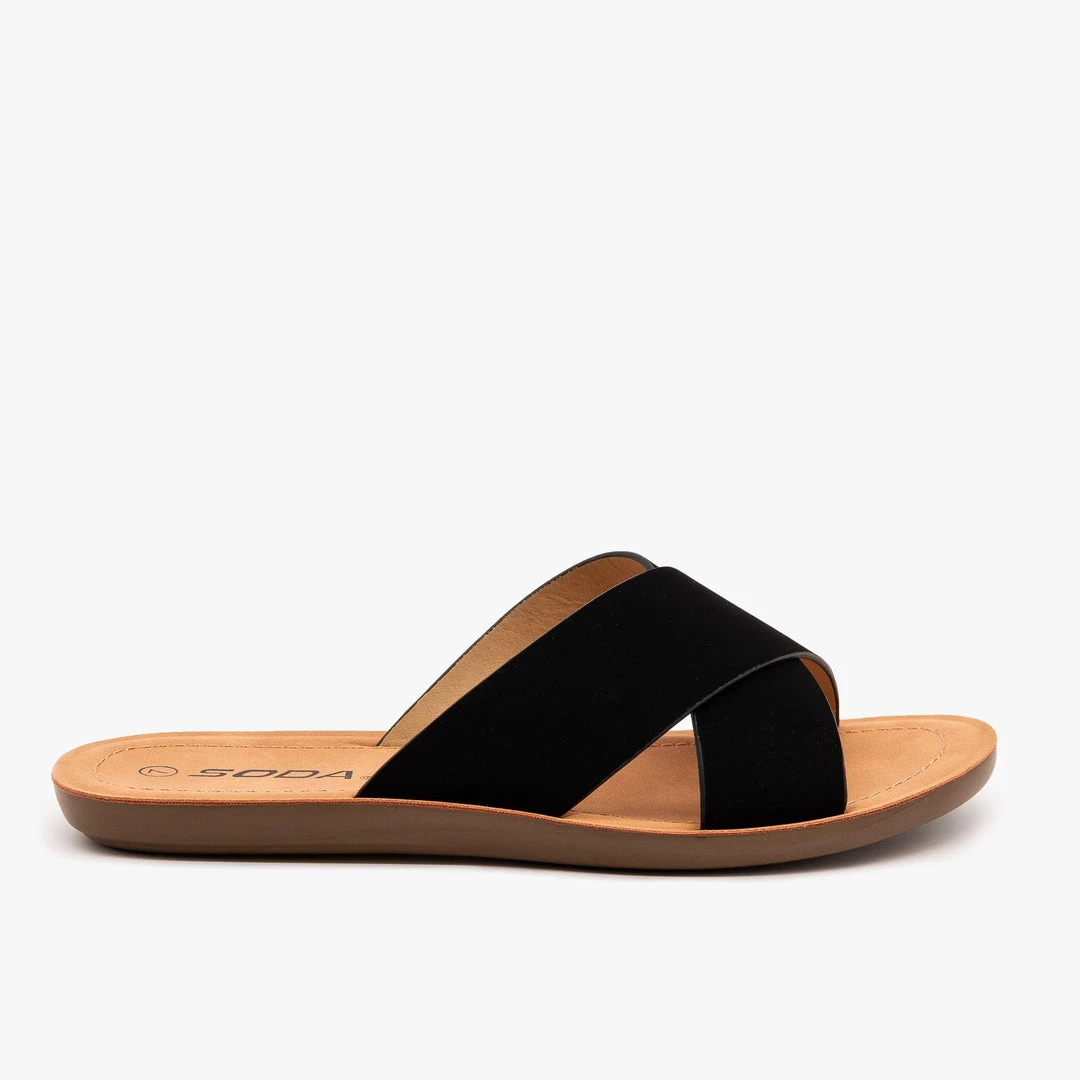 Slip into your new go-to sandal with these Soda Shoes Type-S sandals! Designed with faux nubuck , these sandals feature a chic, minimal design of two wide bands that cross in an even X over the foot. The flat heel and lightly cushioned insole provide lasting comfort. Available in a perfect neutral and a classic black, these sandals compliment every look! Pair them with distressed boyfriend jeans and a crop top or dress them up with a denim skirt and sweater! Made with all man-made/vegan materials and runs true to size.