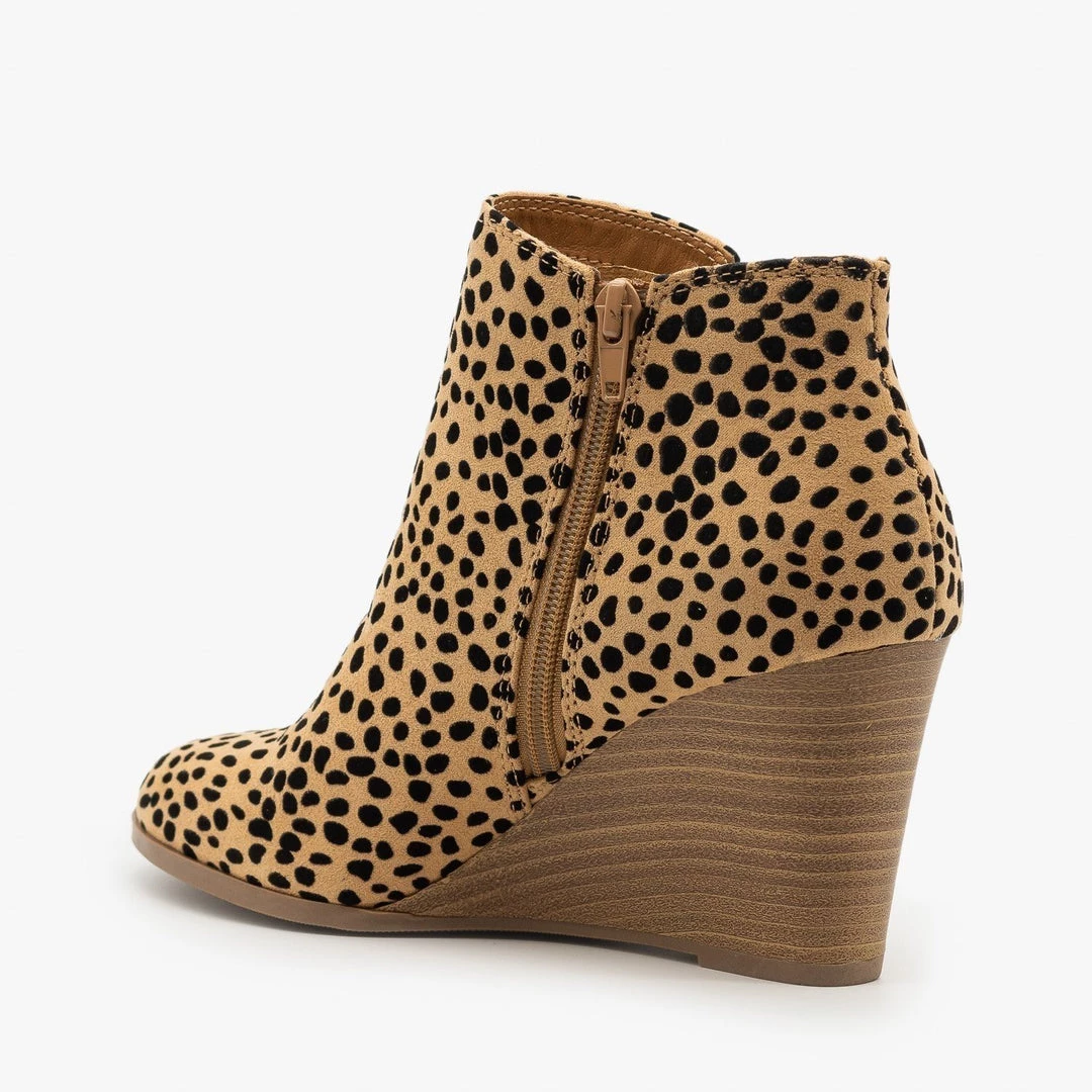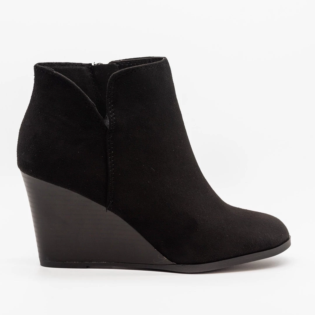 Show off your sense of style with these Soda Shoes Ability-S ankle bootie wedges! Crafted out of faux suede, these bootie wedges feature a classy almond-shaped toe and an interior side zipper for easy on/off access. The 3″ wedge gives these shoes some extra height while the subtle v-cutout on the top of the shoe gives thes shoes a posh finishing touch. You can wear these bootie wedges with a casual bodycon dress and a fitted denim jacket for an adorable fall outfit! Made with all man-made/vegan materials.