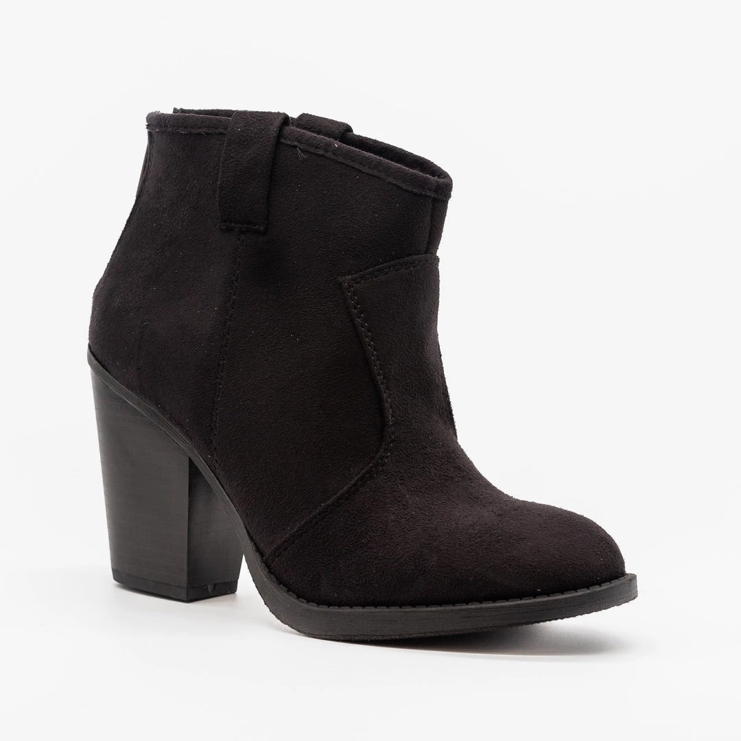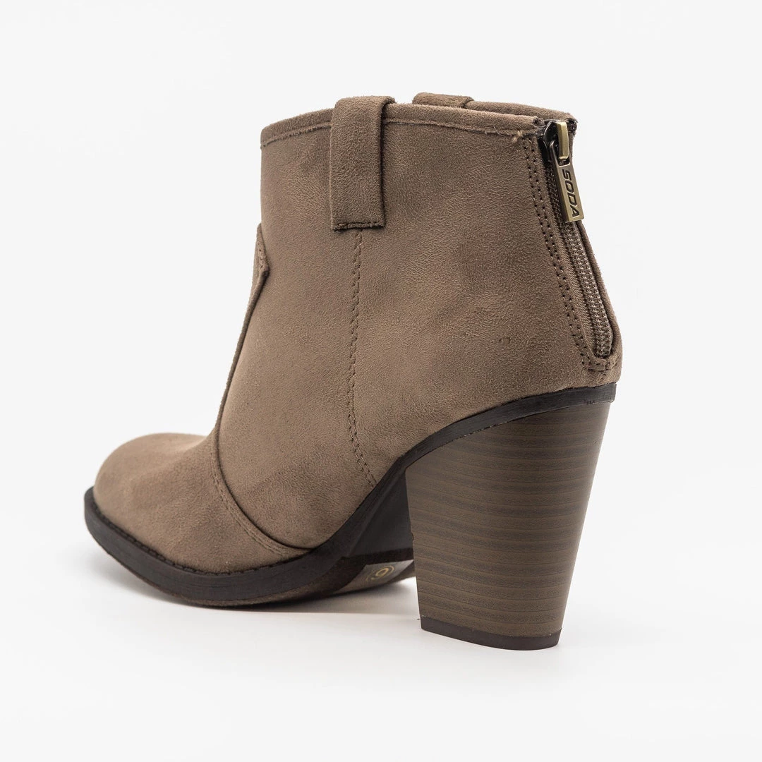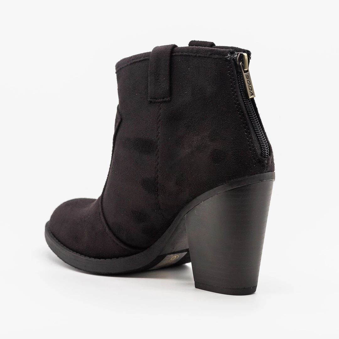 Kick your worries to the curb with these super cute Soda Shoes Albert-S Western-inspired ankle booties! Crafted out of faux suede, these booties feature a back ankle zipper for easy on/off access and a classy almond-shaped toe. The 3″ chunky heel gives these shoes some sassy height while the western design makes these booties extra fashionable. You can wear these booties with a sleeveless skater dress and a fitted denim jacket for an adorable daytime look! Made with all man-made/vegan materials.