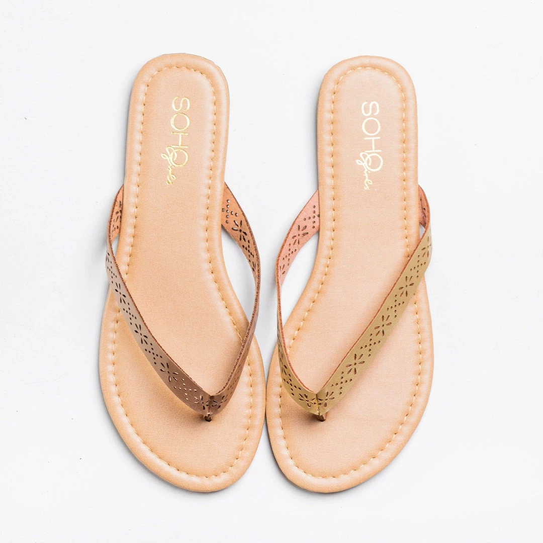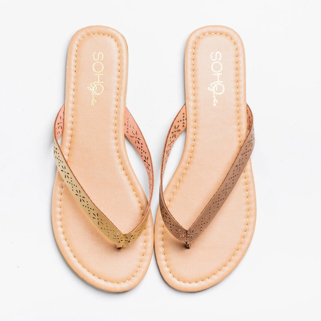 Show off your newest pedicure with these Soho Girls Shoes Sammy-2 flip flops! Beautifully crafted out of faux leather, these sandals feature a classic flip flop style and an easy-to-wear slip-on design for practicality and ease. The gorgeous laser cut design on the straps adds a touch of style and flair to these already fashionable shoes. Pair these sandals with everything from ankle jeans to shorts to dresses! Made with all man-made/vegan materials.