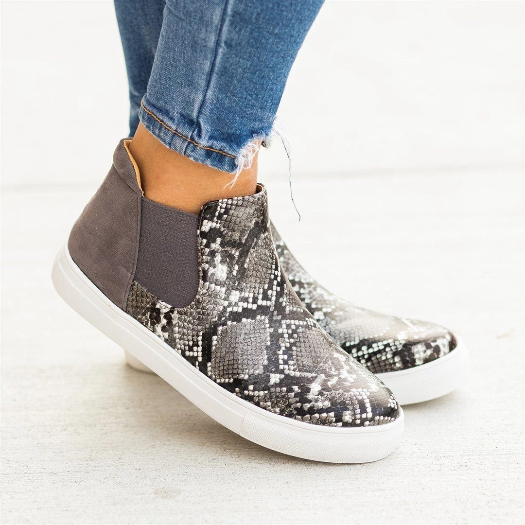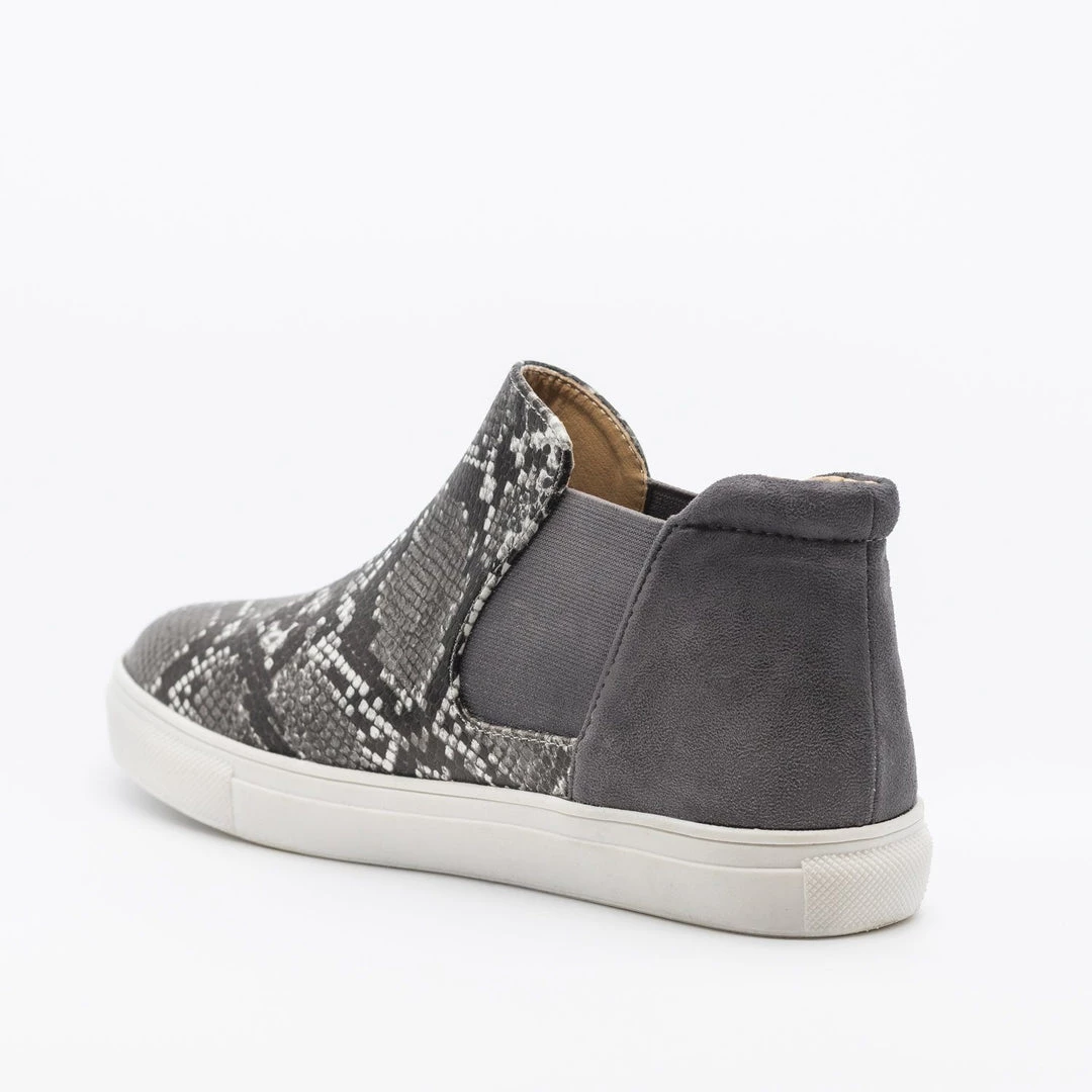 Start a trend with these Soho Shoes Tristen snake print ankle sneakers! Crafted out of faux leather, these sneakers feature a trendy ankle sneaker design and an easy-to-wear slip-on style for practicality. The rubber sole provides extra support and grip. You can wear these sneakers with a pair of ankle jeans or with a basic t-shirt dress for a fun and fashionable look! Made with all man-made/vegan materials.
