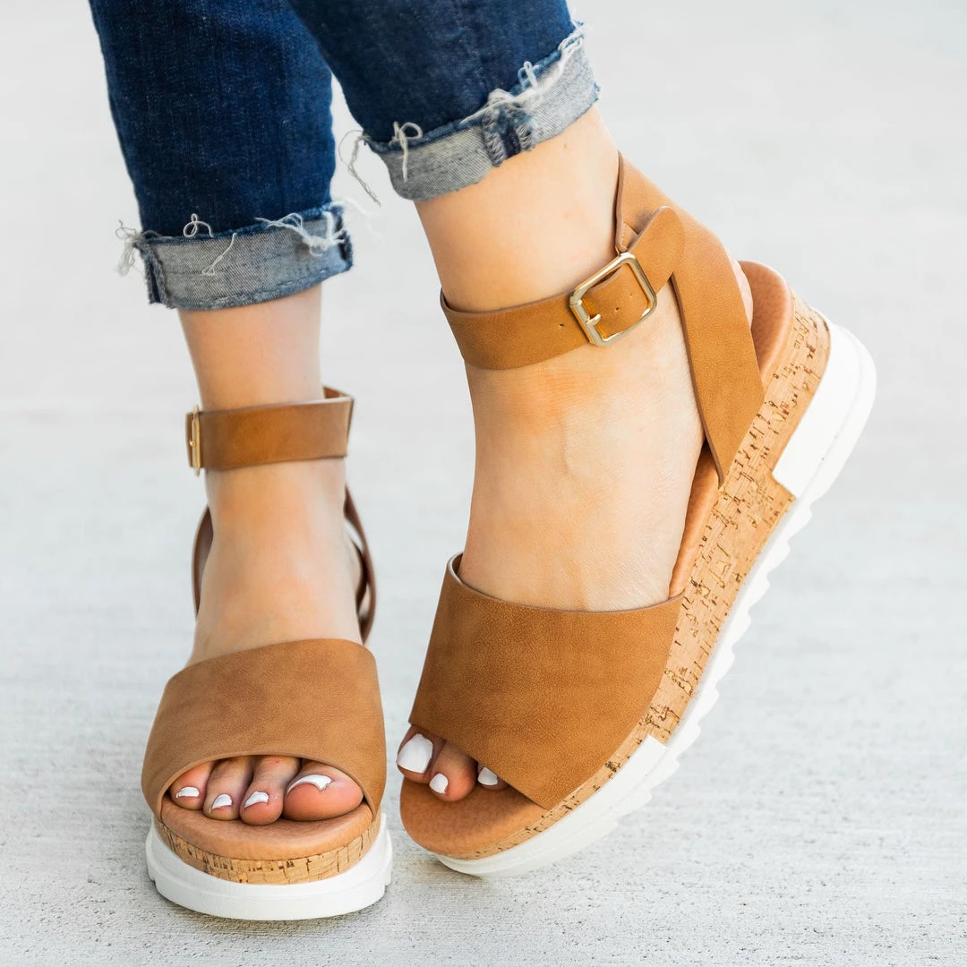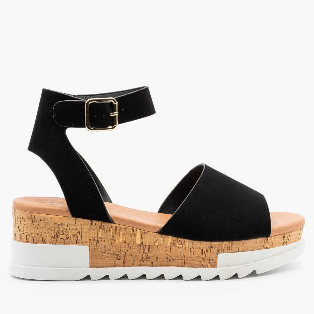 Step into the high life with these Top Moda Shoes Tobias-8 sandals! Designed with faux leather or faux nubuck (black), these chic sandals feature a 1″ platform that rises slightly into an approx. 2″ cork wedge heel. Bright white ribbed tread and white accents at the heel and toe add some sharp detailing. The body features a wide band over the foot, leaving the toes open and a simple back ankle and ankle strap with an adjustable buckle for easy on/off access. Available in several lovely neutral tones, these sandals are perfect for all your warm weather looks! Pair them with baby blue pants and a floral patterned blush top for a springy pastel dream look! Made with all man-made/vegan materials and runs true to size.