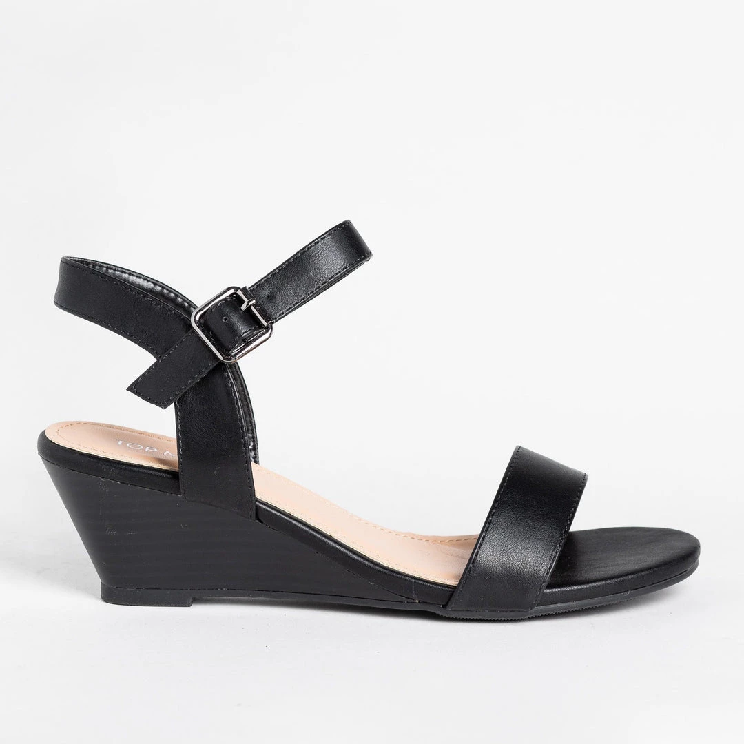 Strut your stuff in style with these lovely Top Moda Shoes Joana-65 sandal wedges! made out of faux leather, these sandal wedges feature an adjustable ankle strap for easy on/off access and a trendy open-toe design. The 2″ stacked wooden wedge gives these shoes some extra style and flair. You can wear these shoes with everything from high-waisted ankle jeans to ruffled asymmetrical dresses to finish off the perfect summer look! Made with all man-made/vegan materials.Â