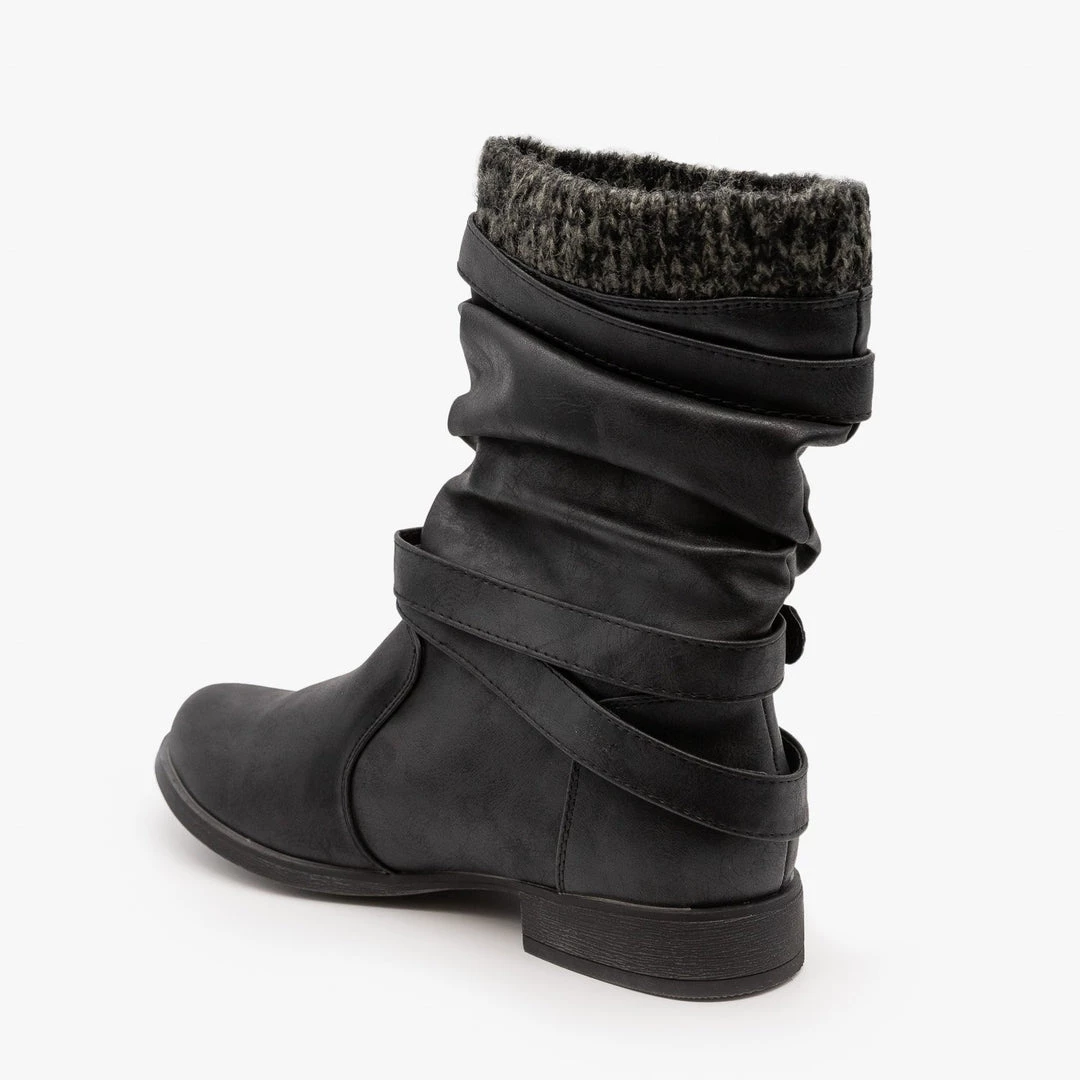Complete your outfit with the Unilady Shoes Indiana-16 boots! Crafted out of faux leather, these boots come up to mid-calf and feature an adorable sweater knit cuff. These boots also feature a slip-on style, a 1″ block heel, and a rounded toe, making these shoes great to wear when you’re on-the-go and when you’re on your feet all day long. Finishing off these boots is a stylish strap design that encircles the length of the boot and is fastened by three posh buckles on the side. You can wear these boots with a pair of jeans, a knotted tshirt, and a knitted cocoon cardigan for the perfect fall outfit! Made with all man-made/vegan materials.