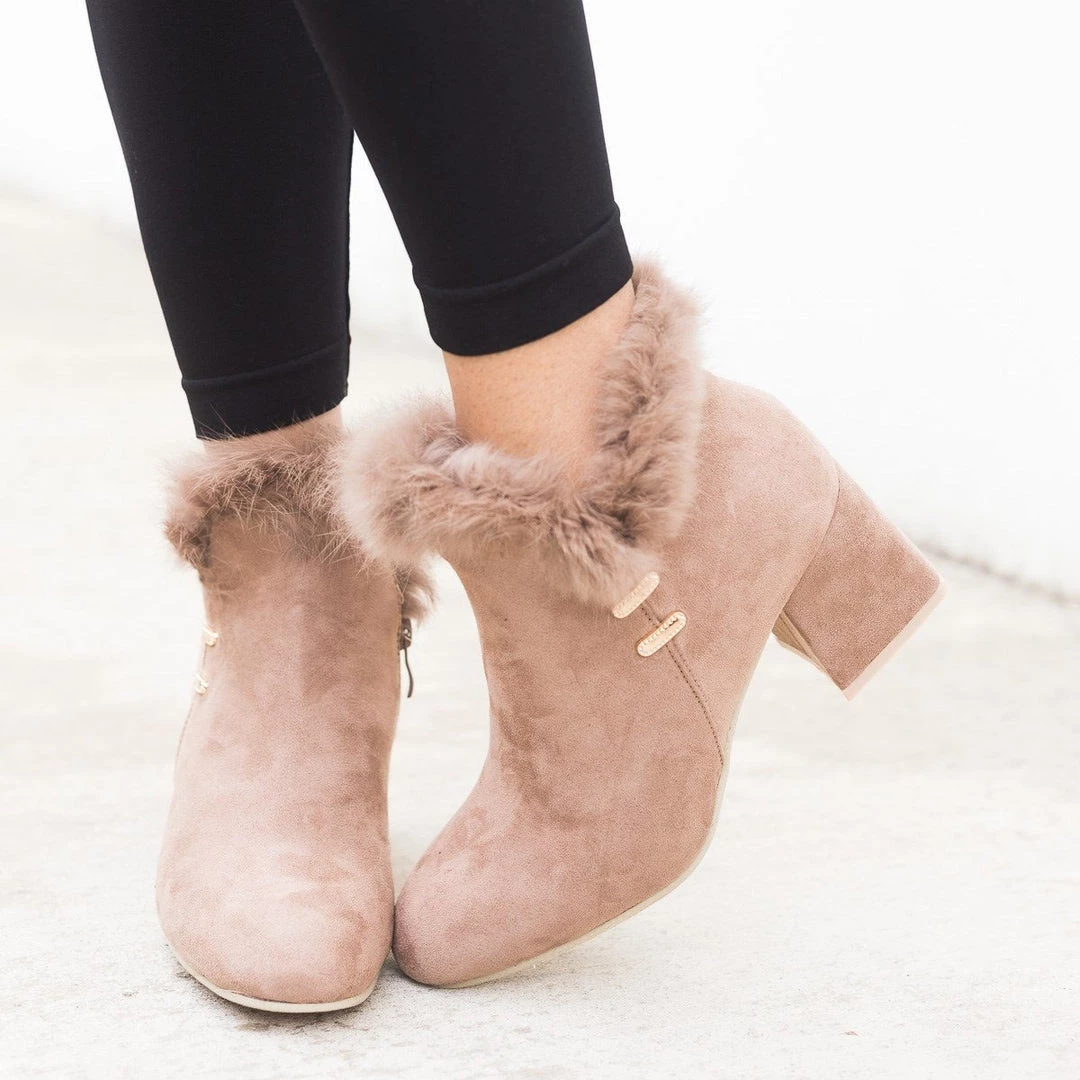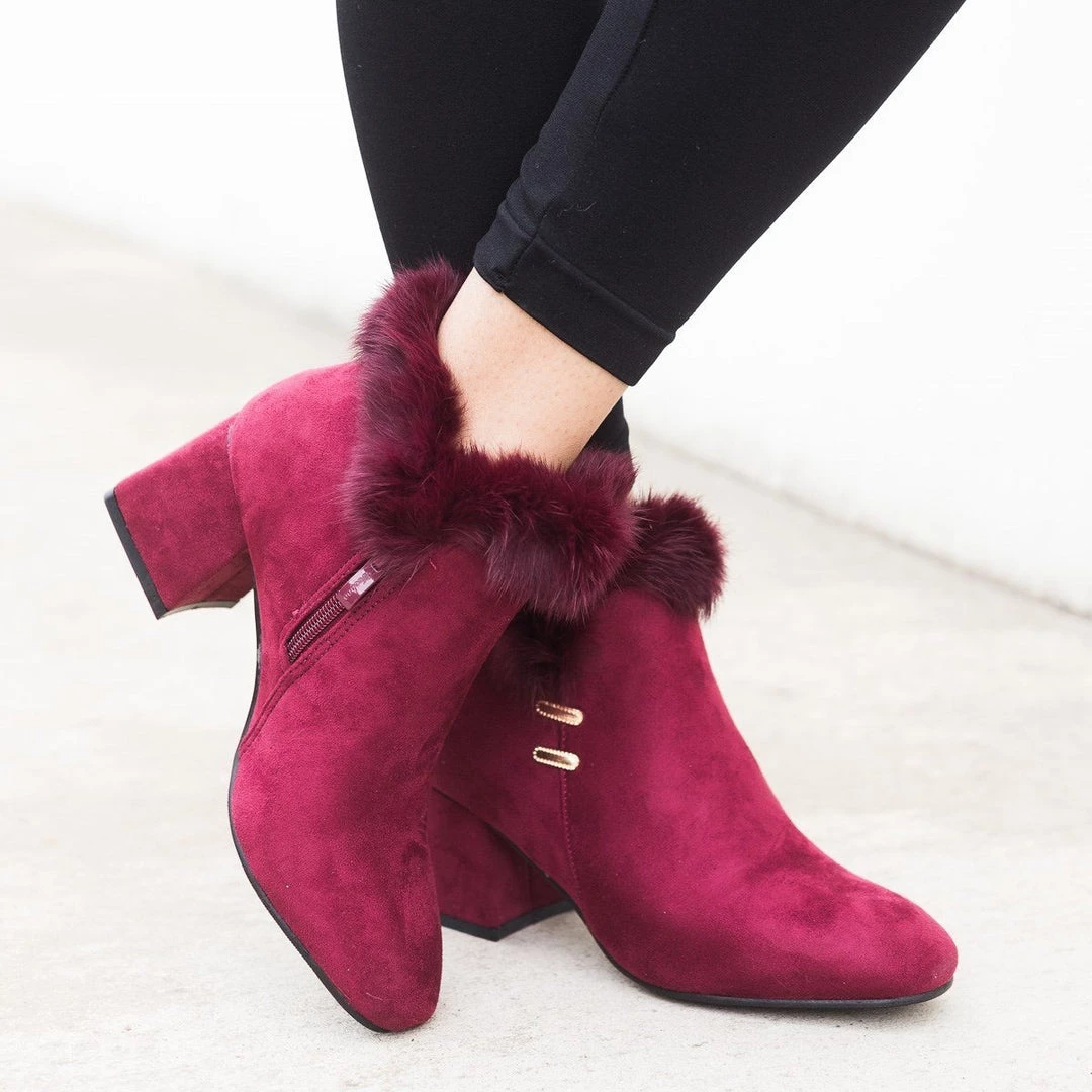 Step into a beautiful pair of booties this season with our Weeboo Lucy-31 shoes. These gorgeous booties feature a full faux-suede body with lovely faux-fur trim that lines the opening of the shoe. The entire shoe has a monochrome design with two decorative gold stitches on the outermost part of the shoe. A functioning inner zipper allows them to be worn with ease and lightly padded insoles provide comfort. Dress it up with leggings, long sleeve turtle neck top and outer coat for a cute winter look.