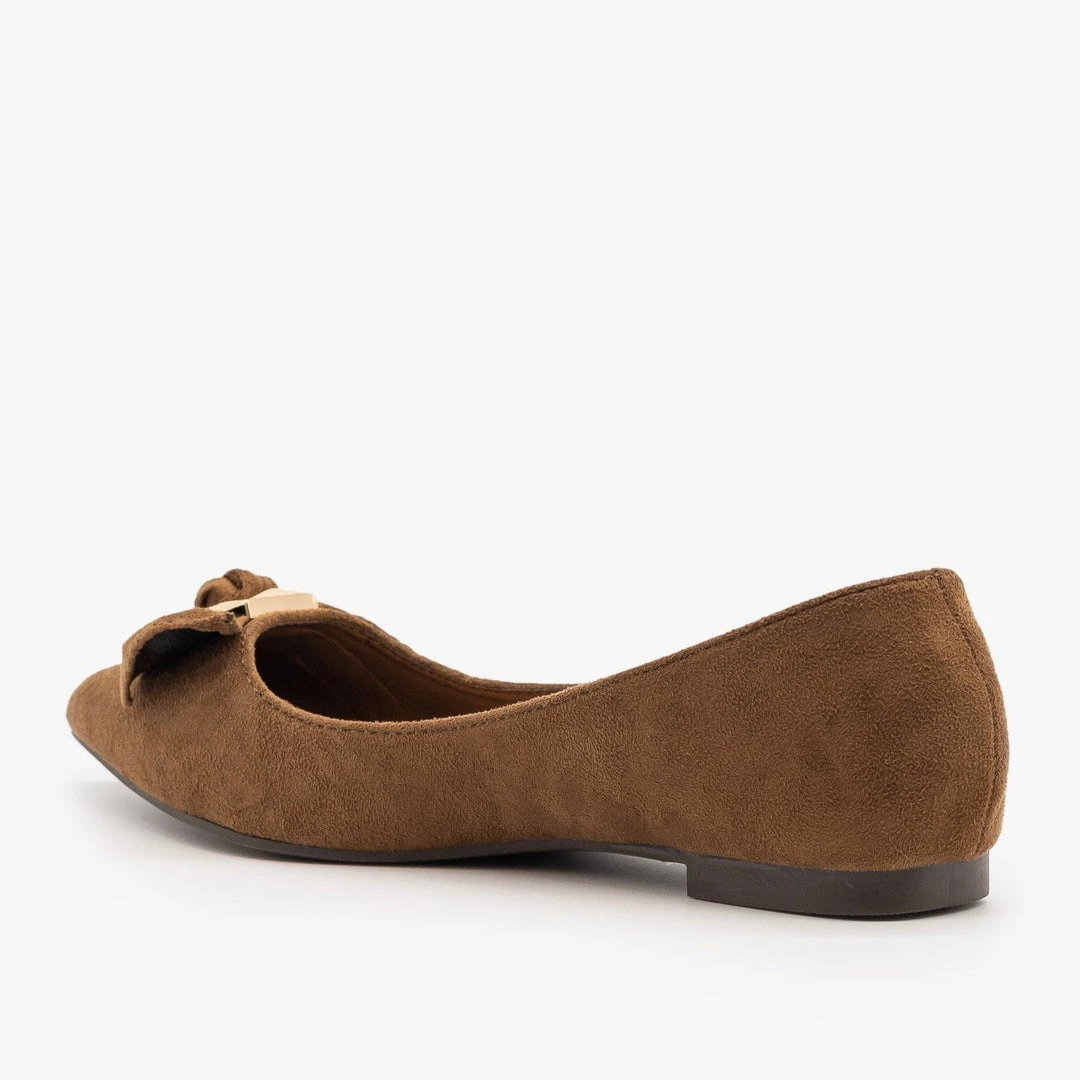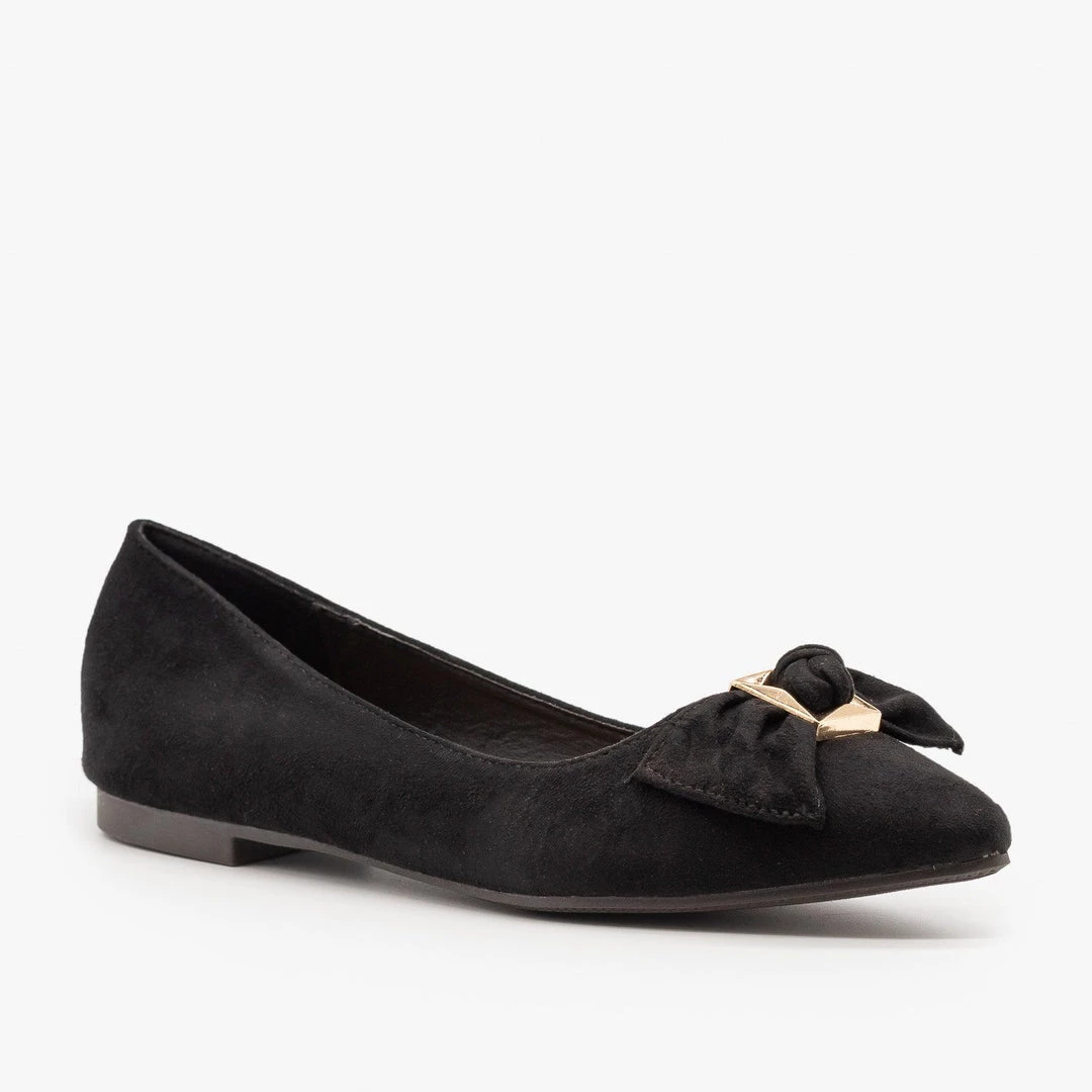 Put a dainty finishing touch on your outfit with these cute Weeboo Shoes Doris-11 ballet flats! Crafted with faux suede, these flats feature a low, one quarter inch heel that adds a little support for your feet and a stylish pointed toe. A matching faux suede bow buckled with a metallic clasp adorns the front of the flat for the perfect finishing touch. Slip these beauties on with a pair of classic black pants and a patterned button down for a classy work day look! Made with all man-made/vegan materials and runs true to size.