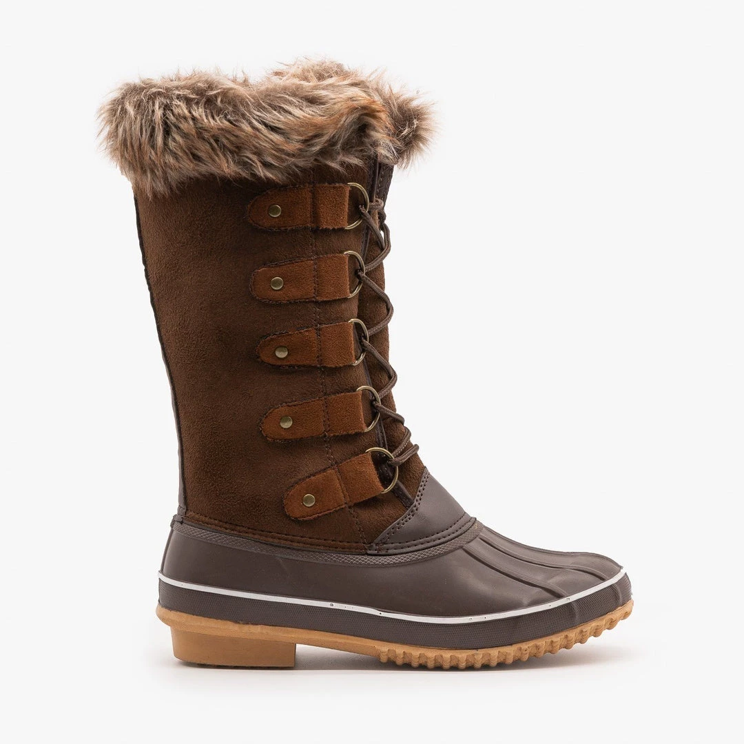 Waltz through the winter wonderland in these cozy Weeboo Shoes Snow-10 boots! Crafted with faux suede, these boots feature a duck boot foot combined with a snow boot top. They have sturdy rubber tread to keep you steady, a rounded toe and a rubber top to keep your toes dry. The body of the boot features a cute lace up design and the top of the boot has a thick faux fur cuff. These boots are a slip on style, making them super easy to wear. Pair them with jean, a sweater and a cozy winter jacket for a cold weather look! Made with all man-made/vegan materials.