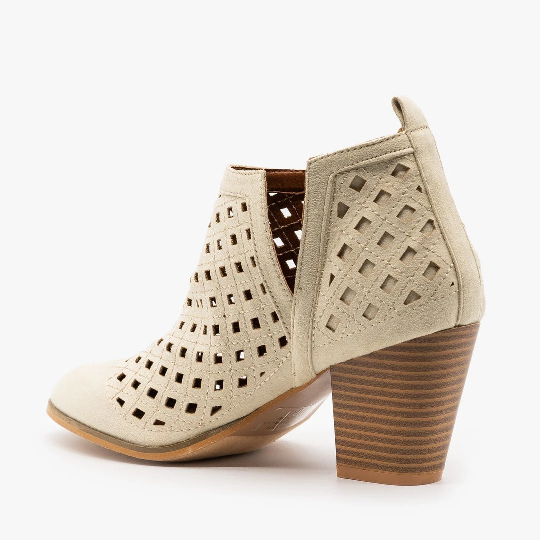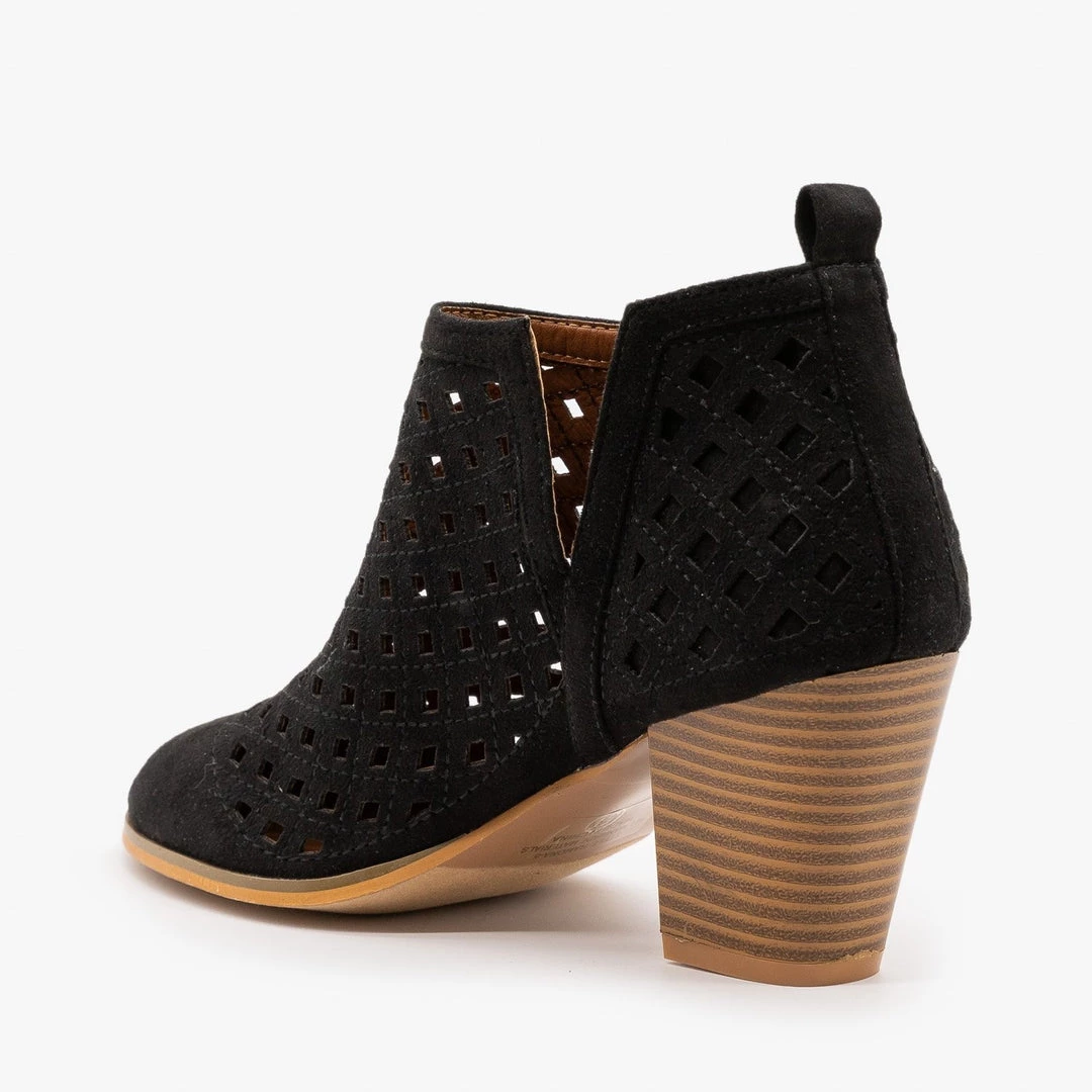 Catch everyone’s eye with these beautiful Weeboo Shoes Ramona-5 booties! Crafted with faux suede, these booties feature a stylish almond shaped toe and an approx. 3″ stacked heel that gives you the perfect amount of height. The body of these booties features a modern laser-cut design that leaves the foot see-through. Cute V-cut cutouts on both sides of the ankle make these booties even more fashionable and let you slip them on and off with ease. For an adorable fall look, pair these booties with wide-legged linen pants, a light blouse and a long, knit cardigan! Made with all man-made/vegan materials and runs one size large. Our model is a size 7 and would prefer a size 6.Â