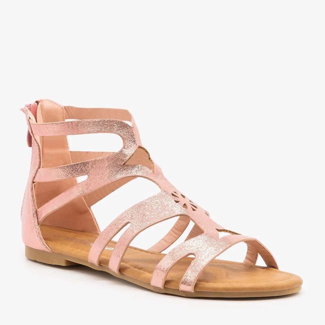 Get that fashionista look with these metallic Weeboo Shoes Malina-51 sandals! These cute shoes feature a strappy body with a pretty laser cut floral design and a cute open toe. They are available in three different colors, all with shiny metallic finishes: black, dusty pink and silver. A back ankle zipper lets you slip them on and off with ease. Pair them with shorts and a crop top or denim jeans and a sweater for a lovely casual look! Made with all man-made/vegan materials and runs true to size.Â