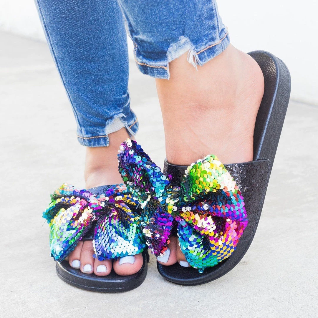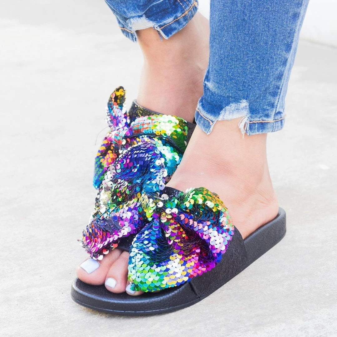 SKU: weeboo-1610394894408 Category: Newest Arrivals Tags: Bow Detail, Glittery, Open-toed, Rainbow, Sandals, Slides, Sparkly, Spo-disabled