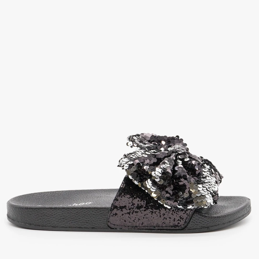 Show off your sparkle in these super cute Weeboo Shoes Kelly-01 slides! These beauties feature an oversized sequined bow, adding the perfect girly touch. The slip on style makes them easy to grab on your way out the door and the foam material keeps your feet comfy all day long. Pair these sandals with your favorite jeans and a cute graphic tee for an easy summer style! Made with all man-made/vegan materials and runs true to size.