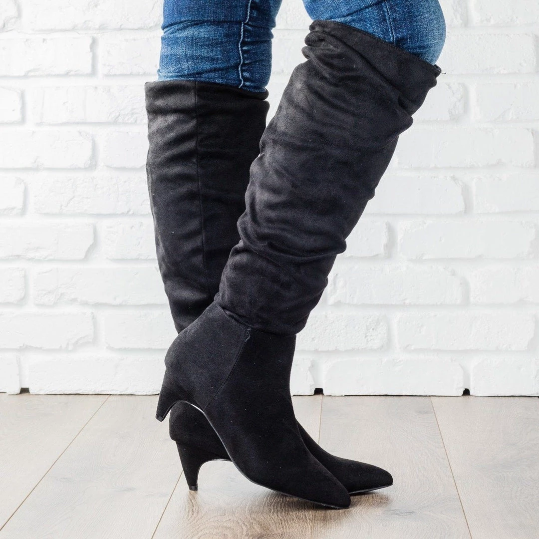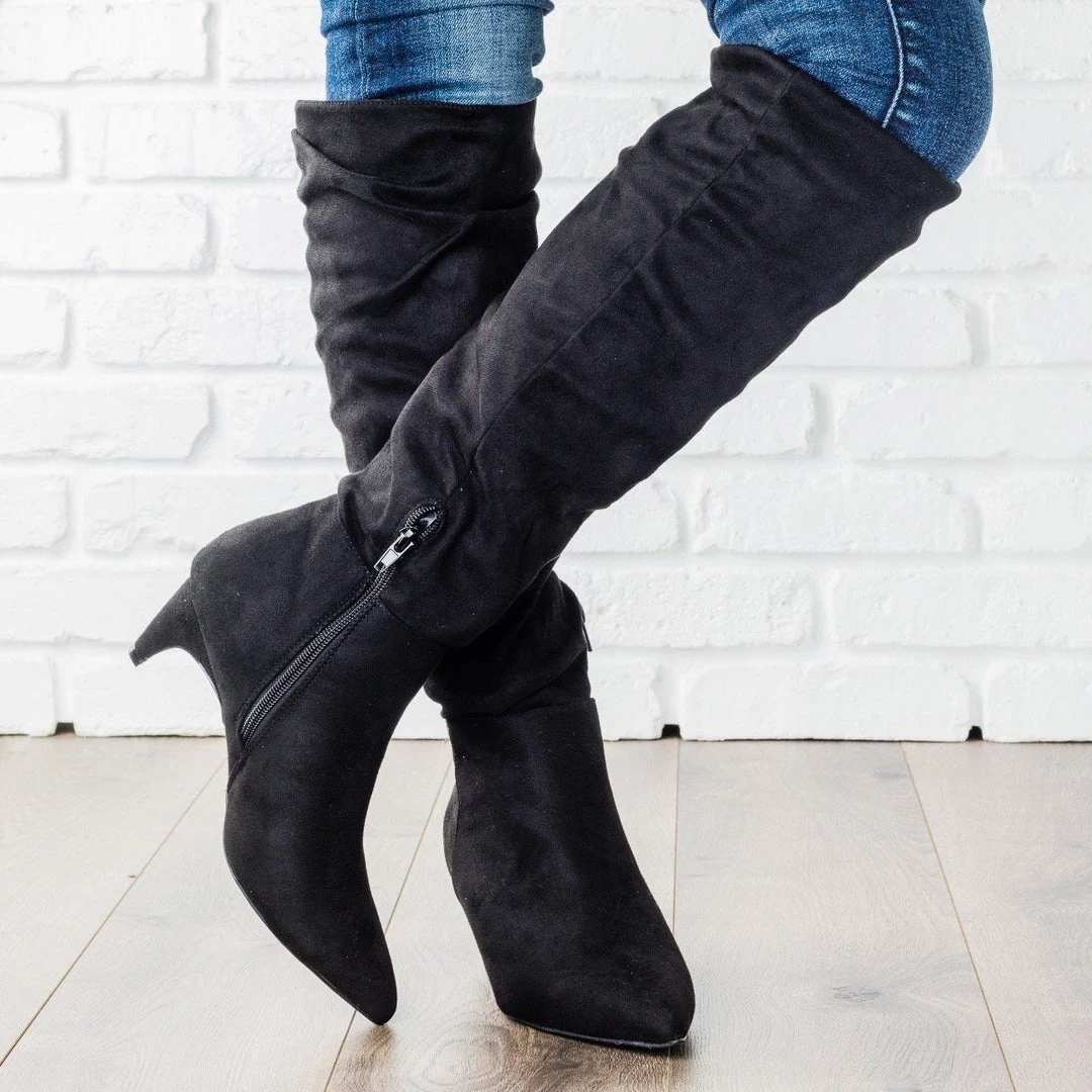 We only have heart eyes for these shoes fit for a diva. The Wild Diva Shoes Fera-10 features a pointed toe, have a gorgeous slouchy body that finishes just under the knee, and a hidden ankle zipper. This posh boot is completed with a 1” kitten heel and faux suede materials. Paired with a pair of dark denim skinny jeans and a ruffly blouse, you will be the definition of glam. Made with all manmade/vegan materials and runs true to size.
