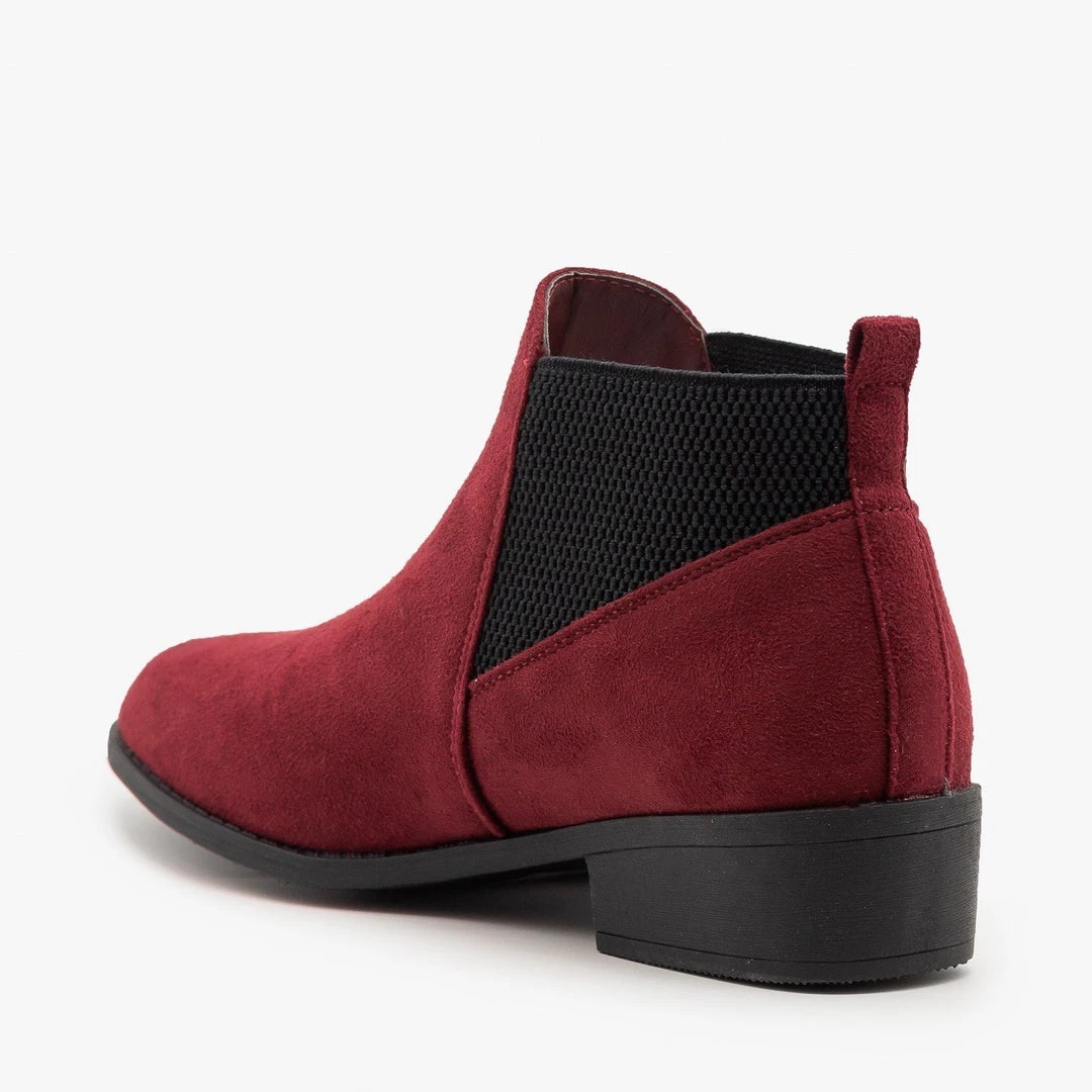 Kick up the dust in these super cute Wild Diva Shoes Eve-01 booties! Crafted with faux suede for a soft finish, these booties feature an approx. 1/2″ block heel and a stylish almond shaped toe. Angled elastic panels on both sides add a unique textural touch and let you slip these booties on and off with ease. The beautiful burgundy color of these booties makes them look amazing with nearly any outfit! Try pairing them with black tights, a dark olive-colored dress and a denim jacket for a super cute look! Made with all man-made/vegan materials and runs true to size.