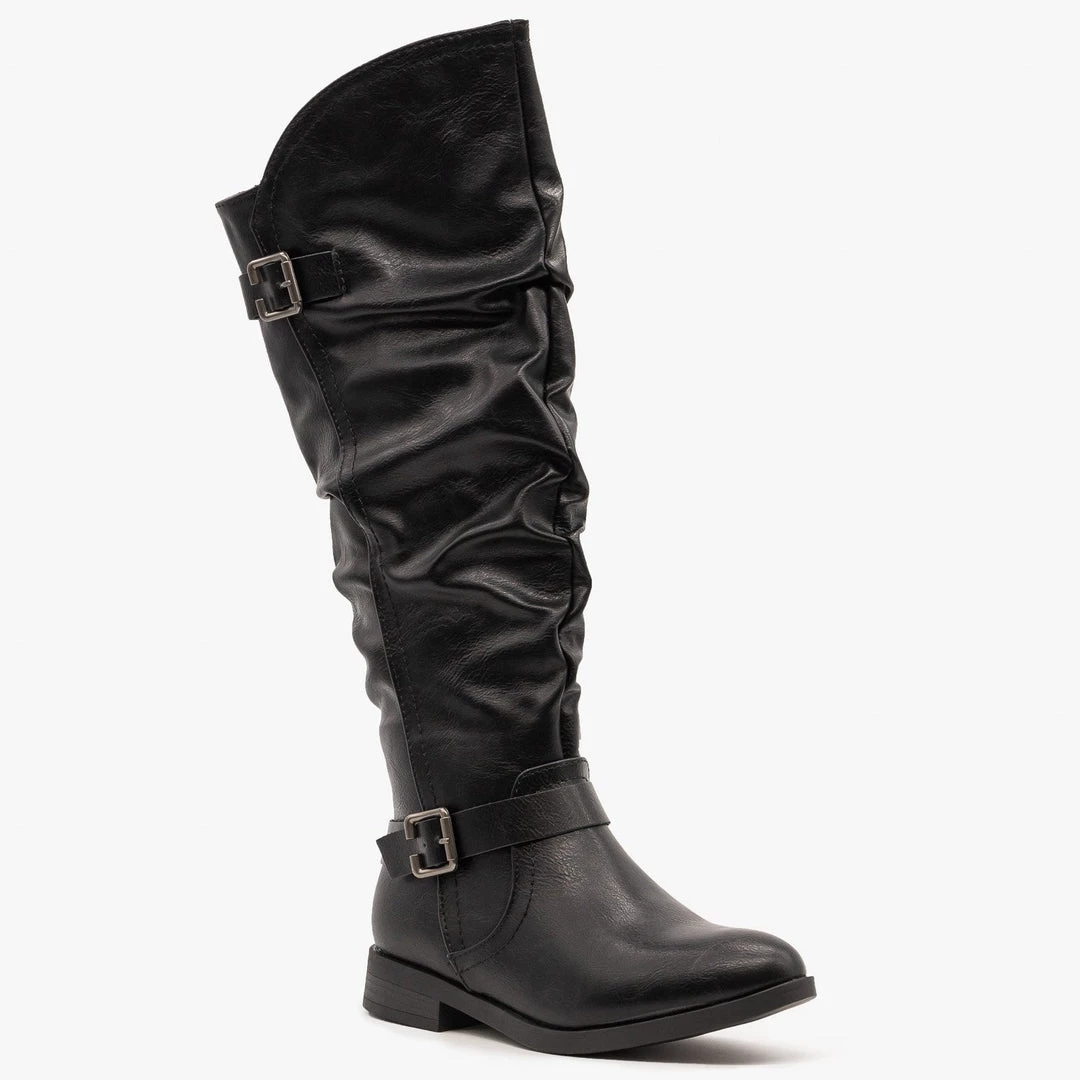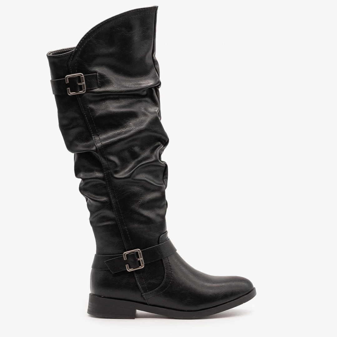 Kick up the dust in these classic Yoki Shoes Reese-40 riding boots! Designed with lightly distressed faux leather, these boots feature a low block heel, stylish almond shaped toe and buckled belt detailing. The body rises to just below the knee and is slightly slouchy for a relaxed yet chic vibe. A full-length zipper allows you to slip these beauties on and off with ease. For a cute school day look, pair these boots with dark wash skinny jeans, a knotted flannel and gold hoop earrings! Made with all man-made/vegan materials and runs true to size.