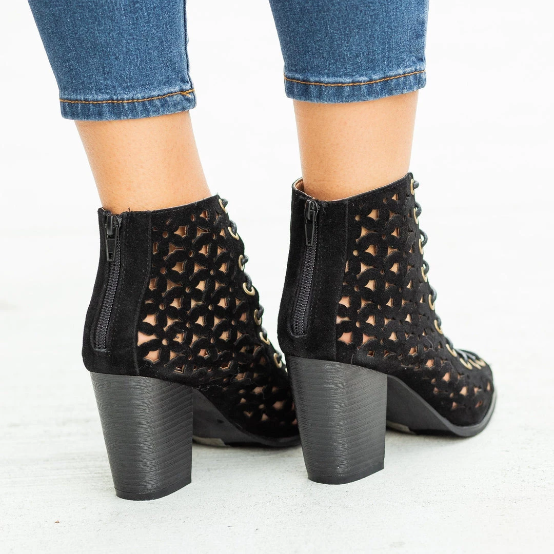 Strut your stuff in style with these beautiful Yoki Shoes Brie-07 open-toe ankle booties! These lovely high-heel booties are made out of faux suede and feature a sexy lace-up design. The trendy open-toe design gives these shoes some extra style and flair while the gorgeous laser cut design throughout the shoe gives these shoes a fresh and stylish look. The 3.5″ stacked heel gives these shoes a bit of height, while the back ankle zipper provides easy on/off access. You can wear these booties with everything from ankle jeans to bodycon dresses! Made with all man-made/vegan materials.