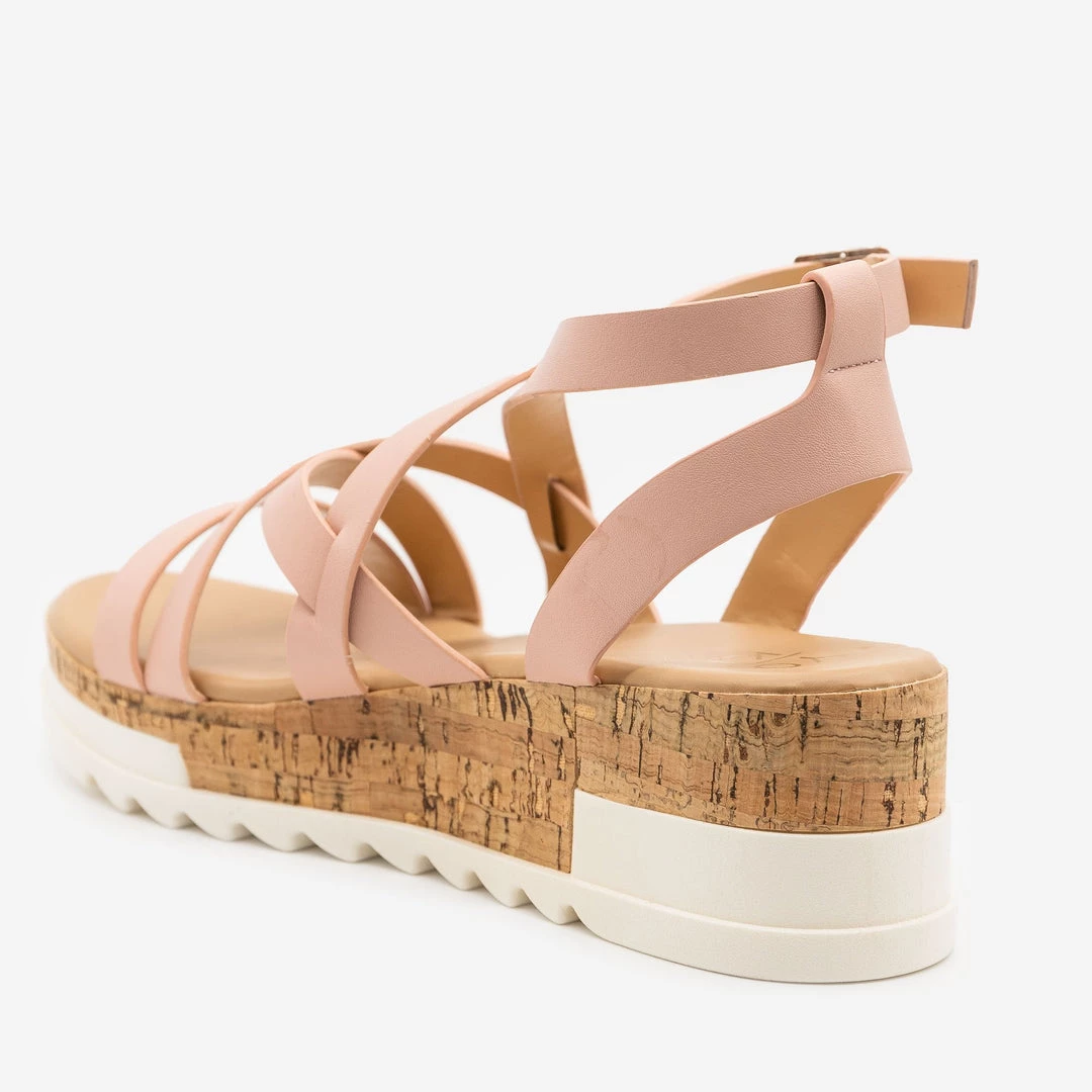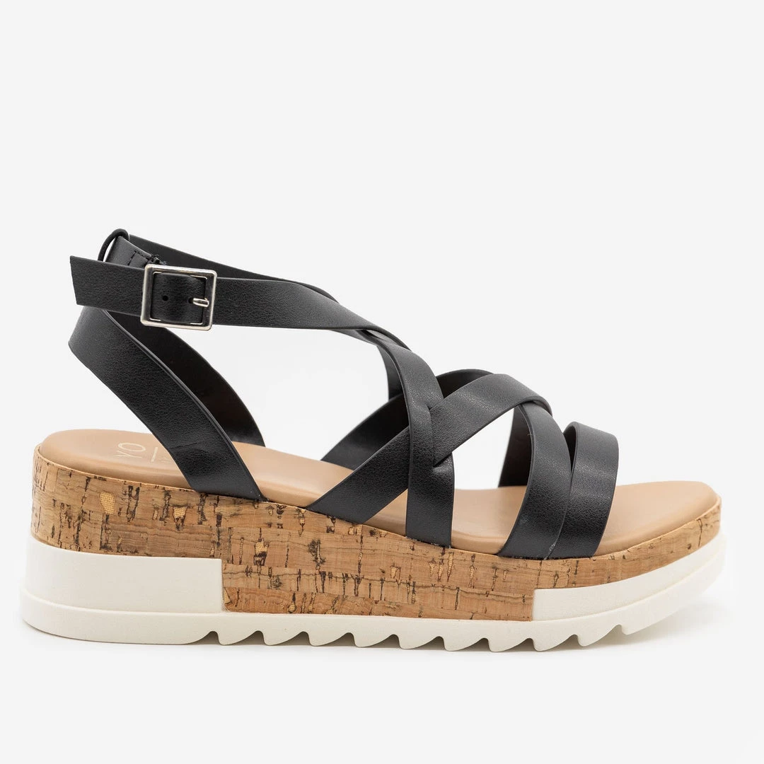 Put your best foot forward in these strappy Yoki Shoes Brenda-55 sandals! These beauties feature a wide cork sole that rises into an approx. 3″ wedge heel. A white ribbed sole and white trim add a chic design element to the base of the shoe while the body stays super classic. Designed with faux leather, thin straps cross and weave through each other for a comfy, supportive style. The ankle strap clasps with a buckle that adjusts for the perfect fit. Pair these sandals with cuffed straight leg jeans, a brown belt and a white v-neck tee for a timeless summer look! Made with all man-made/vegan materials and runs true to size.